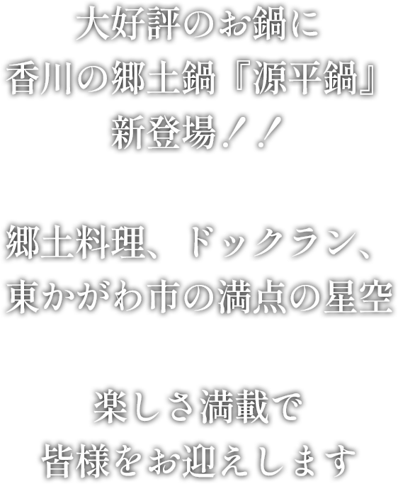 到来!! 大好評のお鍋に香川の郷土鍋『源平鍋』新登場!! 【ENJOY SPORTS】1日中家族みんなでスポーツを遊びつくそう♪* 郷土料理・ドックラン・東かがわ市の満点の星空楽しさ満載で皆様をお迎えします *期間限定:対象プランよりご予約のお客様は『無料』でお楽しみいただけます♪